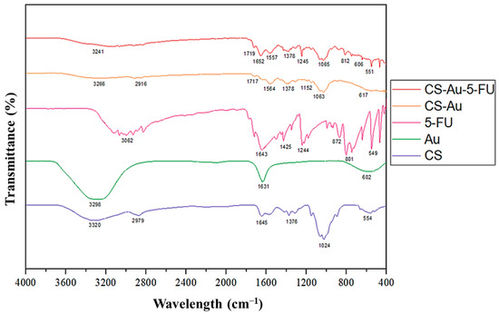 FTIR spectra of CS, AuNP, 5-FU, CS-Au, and CS-Au-5-FU.
