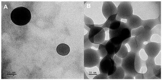 TEM images of the CS-Au hydrogel exhibiting a (A) spherical morphology and (B) a cross-linking matrix.