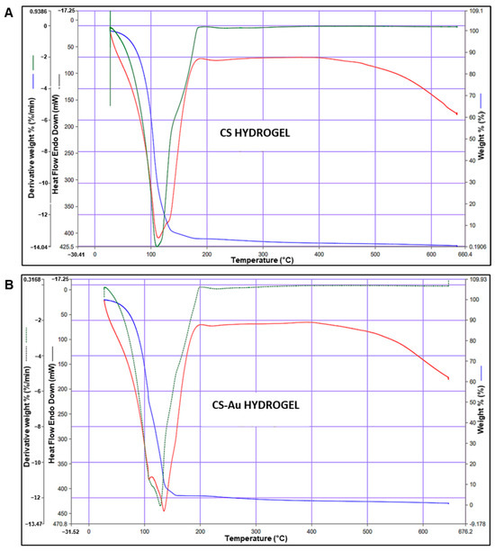Thermogravimetric analysis of the (A) CS and (B) CS-Au hydrogels. The blue lines represent the weight, the green lines the derivative weight%, and the red line represents the differential scanning calorimetry of each hydrogel.