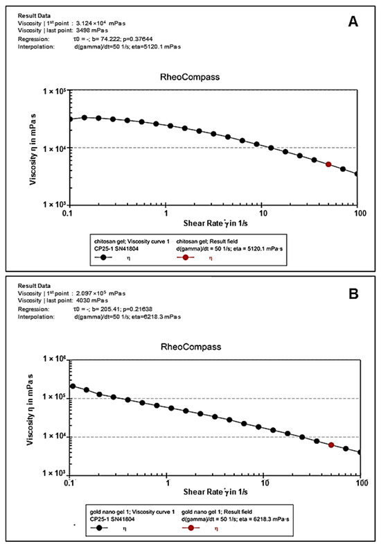 Flow curves depicting viscosity vs. shear rate of the (A) CS and (B) CS-Au hydrogels.