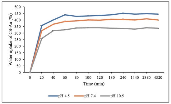 The swelling capacity of the CS-Au hydrogel was assessed using the equilibrium SR in distilled water at room temperature. The study was conducted at pH 4.5, 7.4, and 10.5 to evaluate the pH sensitivity of the hydrogel and its expansion and water absorption when submerged in the various pH solutions. After 20 min, rapid pH-dependent water uptake was observed for the freeze-dried CS-Au hydrogel with swelling ratios of 357.16, 318.57, and 259.1% at pH 4.5, 7.4, and 10.5, respectively (Figure 10). Equilibrium was achieved after 1 h, with the swelling ratios reaching 439.93, 388.23, and 325.87% at pH 4.5, 7.4, and 10.5, respectively. The swelling maxima recorded for the CS-Au hydrogels were 450.77, 409.07, and 340.83 at pH 4.5, 7.4, and 10.5, respectively. The CS-Au hydrogel displayed notable pH dependence, with markedly enhanced water absorption in acidic solutions relative to basic solutions and at physiological pH (Figure 10).