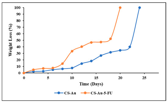 Comparison of the weight loss of the CS-Au and CS-Au-5-FU hydrogels as a function of incubation time in PBS containing 1.5 μg of lysozyme/cm3 at 37 °C.