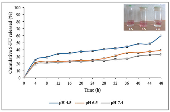 The drug release from the CS-Au-5-FU hydrogel was quantified over a 48 h timeframe in PBS adjusted to pH 4.5, 6.5, and 7.4, respectively, allowing for the assessment of the pH-responsive properties of the hydrogel. Approximately 15 mg of the freeze-dried drug-loaded hydrogel was placed in 5 mL of PBS at the respective pH levels. The experiment was conducted at 37 °C, over 48 h. At intervals of 4 h, 10 µL aliquots of the dialysates were removed and replaced with the same volume of fresh PBS to maintain the sink volume. The drug quantity in the dialysate was determined using UV-vis spectroscopy at a wavelength of 266 nm. The measurements were conducted in triplicate for each sample. The amount of 5-FU released was determined using Equation (4).