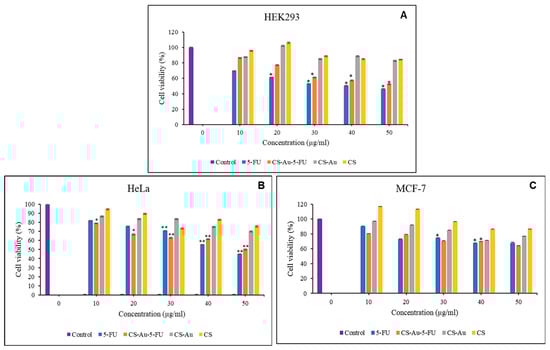 The HEK293, HeLa, and MCF-7 cells were seeded in 48-well plates at a density of 3.5 × 104 cells per well. After a 24 h incubation, the medium was removed from each well and replenished with 200 µL of fresh medium. The CS, CS-Au hydrogels and free 5-FU solutions were added to the cells at varying concentrations (10, 20, 30, 40, and 50 µg/mL). The assay was conducted in triplicate. Cells were incubated for 48 h at 37 °C. Thereafter, the medium was substituted with 200 µL of complete medium containing 20 µL of MTT solution (5 mg/mL in PBS). The cells were then incubated for 4 h at 37 °C. After the MTT-medium mixtures were removed, 200 µL of DMSO was added to dissolve the resulting purple formazan crystals. The absorbances were measured at a wavelength of 540 nm using a Mindray MR-96A microplate reader (Vacutec, Hamburg, Germany), with DMSO serving as the blank. The cell viability was determined using Equation (8).