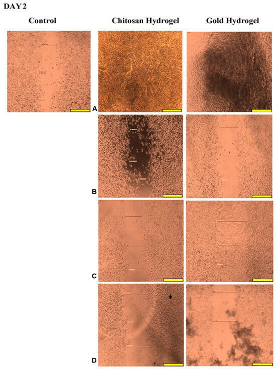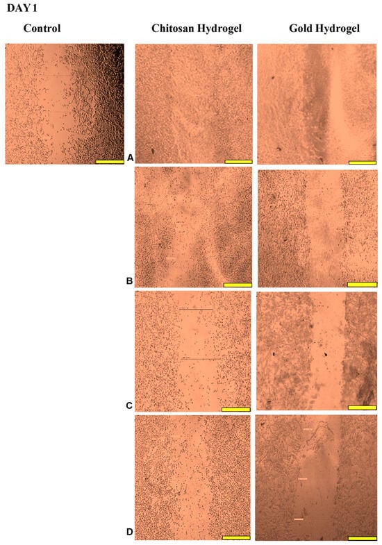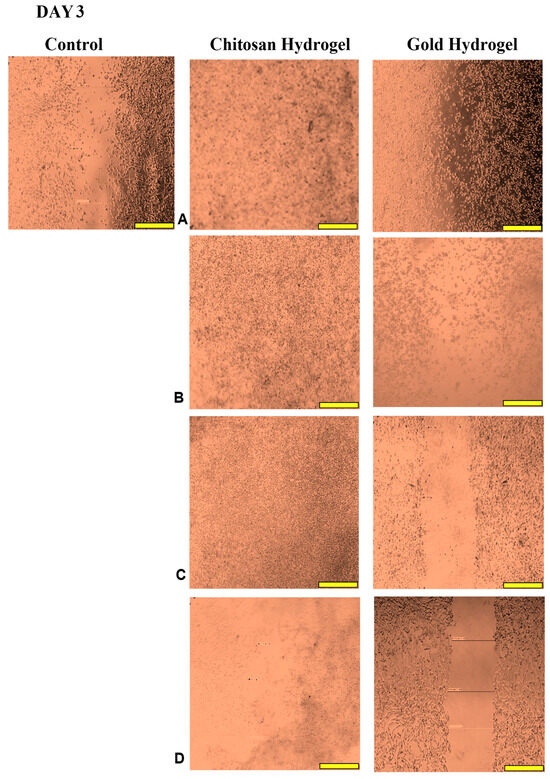 A scratch wound assay was used to measure the growth and migration of the HEK293 cells. The cells were seeded on a 48-well plate with a density of 1.3 × 105 cells per well and incubated at 37 °C for 24 h. A linear wound was created in the monolayer with a sterile pipette tip. The cells were exposed to 15.63, 31.25, 62.5, and 125 µg/mL of the CS and CS-Au hydrogels. The width of the scratched region was measured at three distinct sites to observe cell proliferation directly following the scratch and after 24 h. Images were obtained using a Nikon inverted phase contrast microscope (Nikon, Tokyo, Japan). Wound closure was calculated using Equation (9).