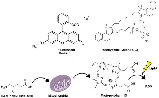 Fluorescence-guided tumor resection (FGR) has proven to be a highly useful, cost-effective, and efficient technique for achieving GTR [6]. The first attempts to find techniques that ensure better intraoperative identification of brain tumor margins using fluorescent agents date back to before 1982 by Murray et al. [7], but it took nearly 30 years for the use of 5-ALA for FGR to be incorporated into daily clinical practice. These initial efforts laid the foundation for the advancement of fluorescence-guided resection in neurosurgery. Since the approval of 5-aminolevulinic acid (5-ALA) in 2017 (5-ALA; Gliolan®; photonamic GmbH and Co. KG [8]) for intraoperative guidance and better visualization of suspected high-grade gliomas, FGR has been shown to improve the volume of the tumor removed as well as the progression-free survival of patients [9]. In addition to 5-ALA, other fluorescent agents, such as sodium fluorescein (SF) [10] and indocyanine green (ICG) (Figure 1) [11] have also been utilized, while many researchers have turned their attention to the use of new dyes that will provide even better visualization of the tumor and will be capable of overcoming the limitations presented by these three fluorescent agents [6]