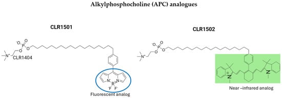 The effective use of APC analogs in the imaging of GBMs, demonstrated both in vivo and in vitro, led researchers to conjugate these substances with green (CLR1501) and near-infrared (CLR1502) dyes to achieve fluorescence-guided resection (FGR) in GBM murine models. CLR1502 and CLR1501, both derived from the conjugation of 18-(p-Iodophenyl)octadecyl phosphocholine (CLR-1401), are being investigated as potential therapeutic and diagnostic agents for the treatment of various cancers, including glioblastoma (Figure 3). The conjugation of CLR-1401 with fluorescent molecules enables targeted intraoperative imaging, as the compound selectively accumulates in cancer cells, allowing for improved tumor visualization during surgery [50,51].