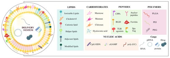 Modifications on delivery systems using peptides and proteins are accomplished in numerous ways, including modification with cell-penetrating peptides (CPPs), targeting ligands, anchoring peptides, antibodies, fusion proteins, and TLR ligands, with encouraging outcomes in preclinical and clinical trials [67,68].