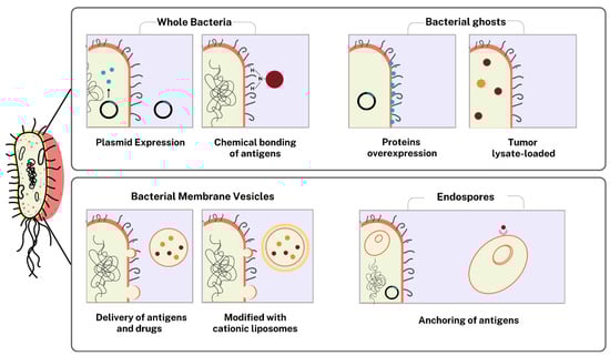 Strategies for bacterial functionalization of vaccine delivery systems. Whole bacteria can be modified by expressing plasmids that produce antigens or by chemically conjugating antigens to their surfaces. Bacterial cell derivatives, such as bacterial ghosts, can be engineered to overexpress immunogenic proteins or incorporate tumor lysate, whereas endospores can anchor antigens. Bacterial membrane vesicles can be used to deliver antigens and drugs, and their functionality can be improved by adding cationic liposomes.
