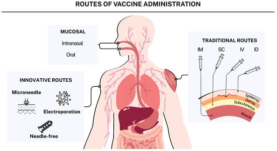 - Bouazzaoui, A.; Abdellatif, A.A.H. Vaccine Delivery Systems and Administration Routes: Advanced Biotechnological Techniques to Improve the Immunization Efficacy. Vaccine X 2024, 19, 100500. [Google Scholar] [CrossRef]