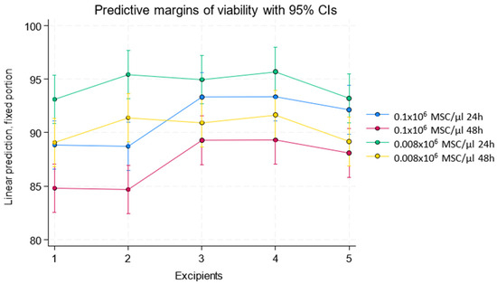 A significant interaction was found between the excipient and the cell concentration used (0.1 × 106 MSC/μL and 0.008 × 106 MSC/μL). Linear predictions for viability showed that, with excipient 1, samples achieved an average viability of 86.82 units with the 0.1 × 106 MSC/μL concentration and 91.09 with the 0.008 × 106 MSC/μL concentration. Excipient 2 showed 86.70 units with the 0.1 × 106 MSC/μL concentration and 93.41 with the 0.008 × 106 MSC/μL concentration. Excipient 3 showed 91.30 units with the 0.1 × 106 MSC/μL concentration and 92.94 with the 0.008 × 106 MSC/μL concentration. Excipient 4 showed 91.33 units with the 0.1 × 106 MSC/μL concentration and 93.67 with the 0.008 × 106 MSC/μL concentration, while excipient 5 showed 90.10 units with the 0.1 × 106 MSC/μL concentration and 91.18 with the 0.008 × 106 MSC/μL concentration (results shown in Table 1 and Figure 1).