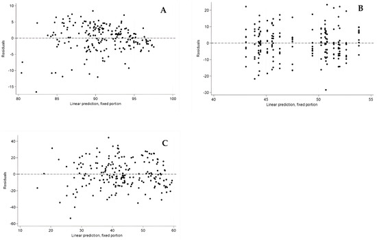 Evaluation of the mixed-effect linear regression model assumptions applied to data on cell viability (A), Ki67 expression as a proliferation marker (B), and cell adhesion (C). The residuals are randomly distributed around zero, with no clear patterns or signs of heteroscedasticity.
