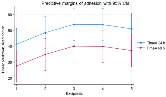 A multilevel mixed linear regression analysis was performed to evaluate cell adhesion as a function of the excipient, the concentration used, and time (24 and 48 h) (Figure 3 and Figure 4A). No statistically significant differences were found in the evaluation of the concentration used (p = 0.965). The differences observed among the excipients showed that excipient 2 increased cell adhesion by 6.35 units compared to excipient 1 (p = 0.049). Excipient 3 showed a significant increase of 10.09 adhesion units compared to excipient 1 (p = 0.002), followed by excipient 4 with 9.74 more units (p = 0.003) and excipient 5 with 8.13 more adhesion units (p = 0.012).