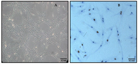 Mesenchymal stem cells were seeded at a concentration of 2000/cm2 onto culture slides and incubated at 37 °C in a 5% CO2 atmosphere. After 24 h, the slides were fixed in 4% paraformaldehyde for 30 min and washed with distilled water for 10 min, followed by three 5 min washes with PBS 1X (Thermo Fisher Scientific, Waltham, MA, USA). Antigen retrieval was performed by treating the sections with citrate buffer (pH 6.0) for 20 min in a heat cooker, followed by three washes with PBS 1X. Next, the slides were incubated with 30% hydrogen peroxide to block endogenous peroxidase activity and washed with PBS 1X.