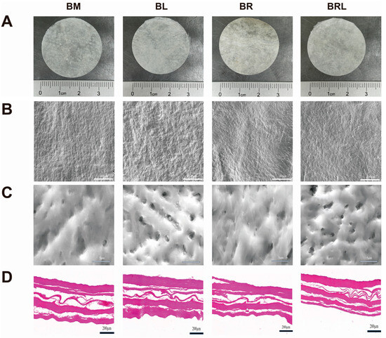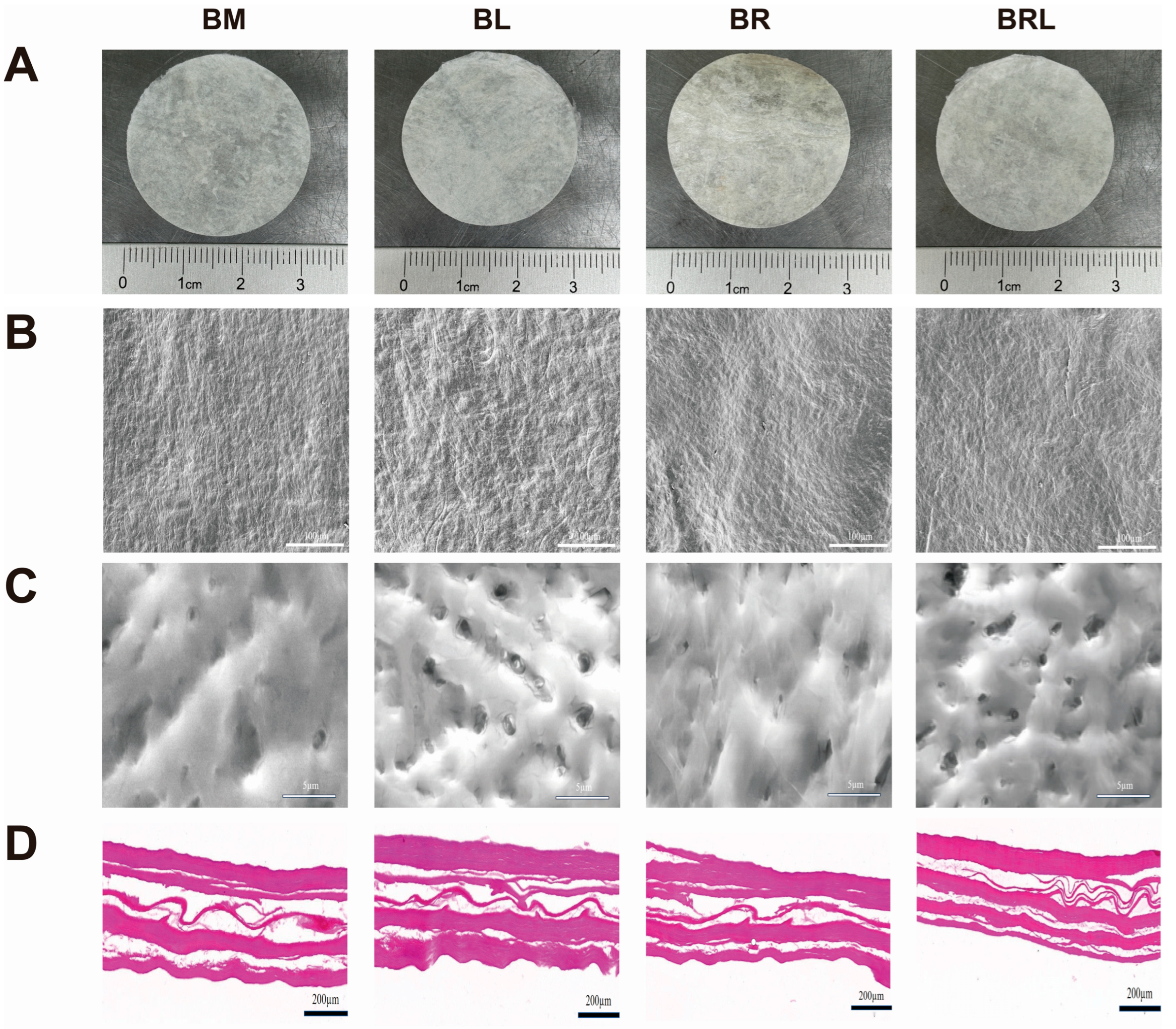 The BM and BL membranes are both white, opaque, and soft in texture and the BR and BRL membranes are light yellow, opaque, and can be processed into various shapes (Figure 1A). The surface features of the four membranes were observed using a scanning electron microscope. At low magnification, it was observed that each group of membranes was composed of a network of fibre structures with a relatively flat surface (Figure 1B). At high magnification, it was observed that the BL and BRL membranes were more porous and had a three-dimensional pore structure (Figure 1C). HE staining results are shown in Figure 1D and they show that all groups exhibited a uniform matrix and filamentous collagen fibres, with no residual blue-purple cell nuclei.