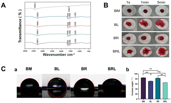 The contact angles for the BM, BL, BR, and BRL were 84.76 ± 1.072°, 71.16 ± 1.475°, 83.04 ± 2.359°, and 65.99 ± 1.270°. The contact angle of the BL was less than that of the BM, and the contact angle of the BRL was less than that of the BR (Figure 2C). There was no statistically significant difference in the contact angles between BM and BR.