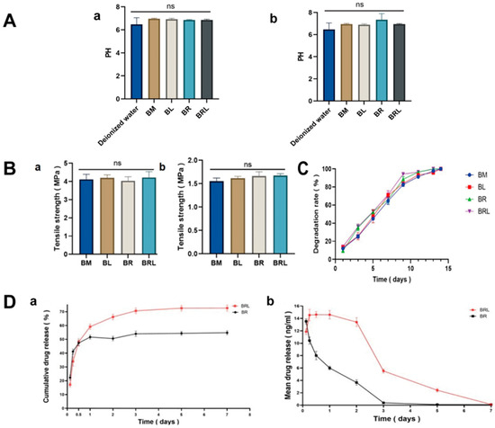 (A) PH of extracts from the four membranes (a) at 1 day and (b) at 7 days; (B) Tensile strength of the four membranes (a) in dry state and (b) in wet state; (C) The degradation rate of the four membranes; (D) Changes in (a) the cumulative and (b) the average in vitro release of RvD1 in the BR and the BRL membrane over time. (ns: p > 0.05).