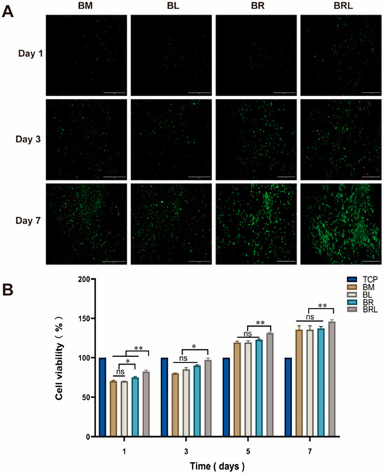 Live cells exhibited green fluorescence in all four groups. At 7 days, it was observed that some cells were tightly connected and that the cells were clustered on the membranes and grew well (Figure 4A). As shown in Figure 4B, on the 1st, 3rd, 5th, and 7th days, the BRL group had a more significant cell proliferation effect (p < 0.01). There was no significant difference between the BM and BL group during the assessment period (p > 0.05). On the 1st day, the cell proliferation rate in the BR group was higher than that in the BM group (p < 0.05).