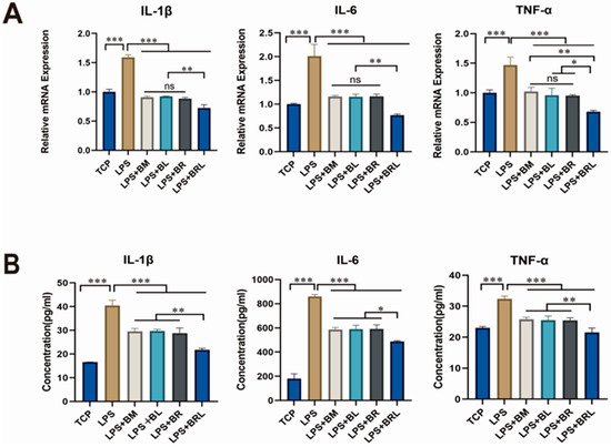 (A) Expression of inflammatory genes of IL-1β, IL-6, and TNF-α under different treatment conditions (TCP, LPS, LPS + BM, LPS + BL, LPS + BR, and LPS + BRL); (B) The concentrations of IL-1β, IL-6, and TNF-α in the supernatant of MG63 cells were determined under different treatment conditions (TCP, LPS, LPS + BM, LPS + BL, LPS + BR, and LPS + BRL). (***: p < 0.001, **: p < 0.01, *: p < 0.05, ns: p > 0.05).