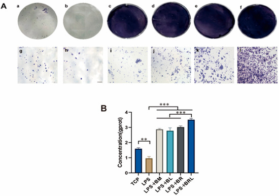 (A) ALP staining after 7 days of osteogenic induction under different treatment conditions: TCP (a,g), LPS (b,h), LPS + BM (c,i), LPS + BL (d,j), LPS + BR (e,k), and LPS + BRL (f,l) (×20); (B) Quantitative analysis of ALP staining. (***: p < 0.001, **: p < 0.01.).