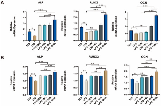 Expression of osteogenic genes of ALP, RUNX2, and OCN under different treatment conditions (TCP, LPS, LPS + BM, LPS + BL, LPS + BR, and LPS + BRL) after (A) 7 days and (B) 14 days. (***: p < 0.001, **: p < 0.01, *: p < 0.05, ns: p > 0.05).