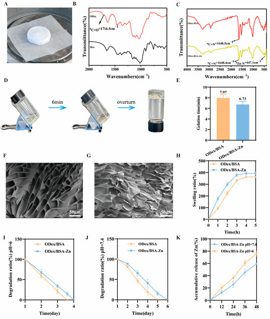 3.2. Fabrication and Characterization of the ODex/BSA-Zn Hydrogel