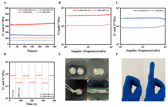 Essential for hydrogels to adequately protect wounds are optimal mechanical and regeneration characteristics [50]. In this study, the rheological behavior of ODex/BSA and ODex/BSA-Zn hydrogels were evaluated by monitoring the changes in storage modulus (G′) and loss modulus (G″) over time under constant frequency (1 Hz) and strain (1%) conditions. As depicted in Figure 2A, the storage modulus (G′) was consistently exceeded by the loss modulus (G″), indicating the favorable structural stability of both the ODex/BSA-Zn and ODex/BSA hydrogels. Owing to its higher cross-linking density, the ODex/BSA-Zn hydrogel exhibited the higher G′ value, reaching up to 348 Pa. Furthermore, within the frequency range of 0 to 100 rad/s, G′ remained consistently higher than G″ without any crossover, further confirming the excellent stability of both hydrogels (Figure 2B,C).