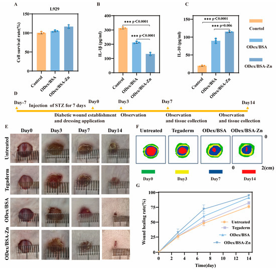 In vitro cytotoxicity and anti-inflammatory activity of ODex/BSA-Zn hydrogel and in vivo wound healing of ODex/BSA-Zn hydrogel. (A) Mouse fibroblast survival. (B) Pro-inflammatory factor IL-1β content in mouse macrophage supernatants. (C) Anti-inflammatory factor IL-10 content in mouse macrophage supernatants. (D) Illustration of wound therapy for diabetic mice. (E) Wound images under various treatments at Days 0, 3, 7, and 14. (F) Traces of wound healing. (G) Quantitative analysis of wound healing rate based on wound area. Data are expressed as means ± SD. *** p < 0.001.