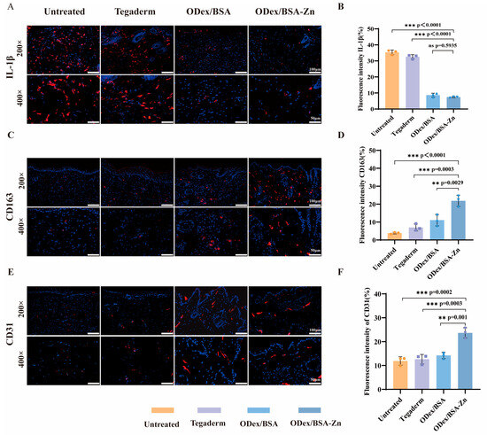 Immunohistochemical staining of wound tissue was conducted to evaluate the expression of IL-1β, CD163, and CD31 to assess inflammatory activity and blood vessel formation within the wound microenvironment. These cytokine expression patterns were examined to better understand the molecular mechanism by which the ODex/BSA-Zn hydrogel promotes faster wound healing.
