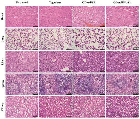 The in vivo safety of the ODex/BSA-Zn hydrogel was also evaluated in this study. Behavioral and histological analyses in major organs were conducted in diabetic mice over a 14-day treatment period. No significant behavioral abnormalities were observed throughout the administration period. At the end of the 14th day, the major organs of the mice were stained using H&E staining (Figure 6). The histological results showed that ODex/BSA-Zn hydrogel administration within the therapeutic did not cause any damage to the mice, conclusively verifying the complete biosafety profile of this therapeutic strategy.
