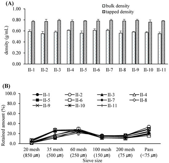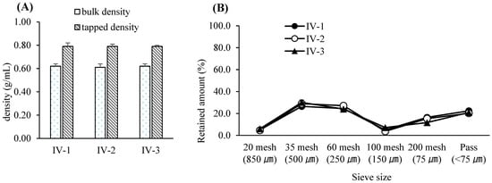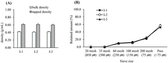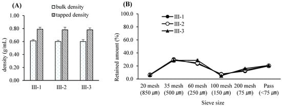 (A) Bulk and tapped densities of post-blended granules resulting from various blending times. Each value represents the mean ± S.D. (n = 3). (B) Particle size distribution of post-blended granules resulting from various blending times. Each value represents the mean ± S.D. (n = 3).