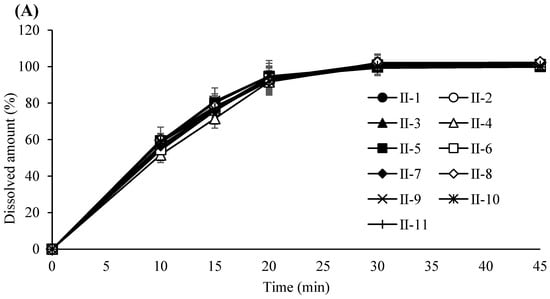 (A) Dissolution profile of tablets compressed at a 5 KN compression force. Each value represents the mean ± S.D. (n = 6).; (B) Dissolution profile of tablets compressed at a 14 KN compression force. Each value represents the mean ± S.D. (n = 6). (C) Dissolution profile of tablets compressed at a 23 KN compression force. Each value represents the mean ± S.D. (n = 6).