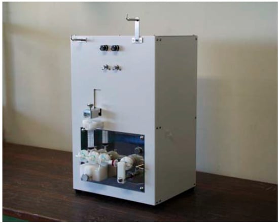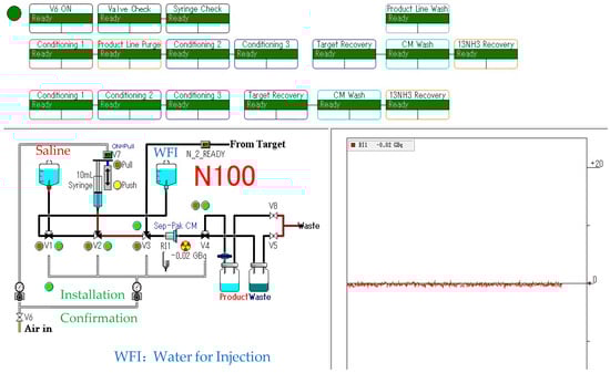 [13N]NH3 was synthesized using an automated module N100 Sumitomo Heavy Industries, Ltd. (Tokyo, Japan), which was approved by PMDA as a medical device (Figure 1). Its software block diagram is shown in Figure 2. Irradiation time for synthesis was fixed at 5 min with a beam current of 50 μA. The target was loaded with 10 mmol/L of ethanol in water for production via the nuclear reaction 16O(p,α)13N. The target water was introduced into an Accel CM column that trapped [13N]NH3. The column was eluted with injectable water and then drained with physiological saline to obtain a drug product as an injectable drug [27,28,29,30,31].