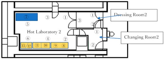 We performed environmental measurements of airborne bacteria, adherent bacteria, and airborne particles in both the hot cell and the room of Hot Lab 2, as illustrated in Figure 3. The measurement results for the hot cell are shown in Table 7, while data for hot lab2 are shown in Table 8.