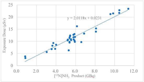 Correlation between [13N]NH3 product (GBq) and exposure dose (μSv).