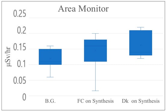 Exposure and leakage doses were measured using an area monitor. Background measurements prior to irradiation were 0.12 μSv/h (background). Post-irradiation values were 0.15 μSv/h in front of the hot cell and 0.16 μSv/h at the computer desk, as shown in Table 6 and Figure 7. The area monitor was installed on the wall in the center of the room and did not change depending on the location, so the leakage dose before and after irradiation was thought to be within the measurement error.