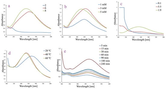 The influence of the parameters known to affect the AgNPs green synthesis process was tested by employing several experiments which were monitored through UV-Vis spectroscopy in the wavelength domain between 300 and 600 nm. Thus, synthesis was assessed in various conditions of pH (Figure 1a), AgNO3 concentration (Figure 1b), ratio between plant extract and AgNO3 (Figure 1c), temperature (Figure 1d), and stirring time (Figure 1e). Each parameter was varied independently to identify optimal synthesis conditions that promote efficient AgNPs synthesis, indicated by a characteristic SPR peak in the 400–450 nm range. At the same time, visually, the change in the color of the solution from light yellow to dark brown was observed.