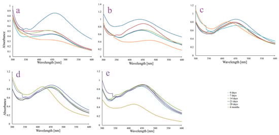 In PBS at pH 6 (Figure 2c), the SPR peak remained relatively stable during the first 28 days. However, a slight red-shift and broadening were detected over time. By 6 months, the peak maintained its intensity along with a displacement phenomenon of λmax towards a shorter wavelength, suggesting a small degree of aggregation, likely influenced by the acidic pH and ionic environment.