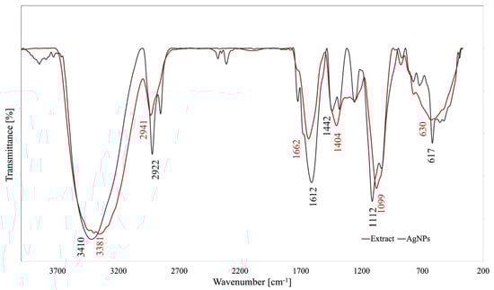 FTIR analysis is an important tool used in the elucidation of the phytocompounds (by their functional groups) involved in the AgNPs biosynthesis as reducing and/or capping agents. Both the FTIR spectra of A. melanocarpa berry extract and of its derived AgNPs are illustrated in Figure 3.