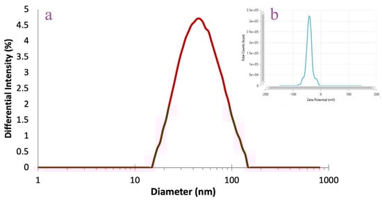 DLS analysis of AgNPs: hydrodynamic diameter (a) and zeta potential (b).