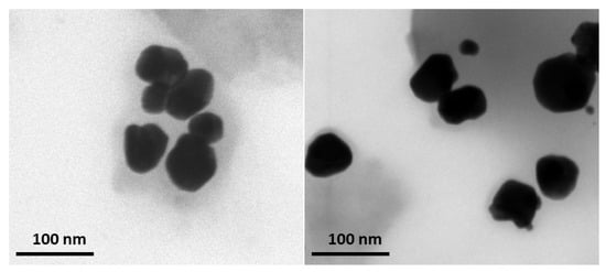 The morphological characteristics of the AgNPs were assessed by the TEM technique. TEM micrographs of the A. melanocarpa berry extract-derived AgNPs (Figure 5) show that the green synthesized particles are well dispersed with a spherical shape with homogeneous sizes and shapes and with a light gray colored area corresponding to AgNPs margins.