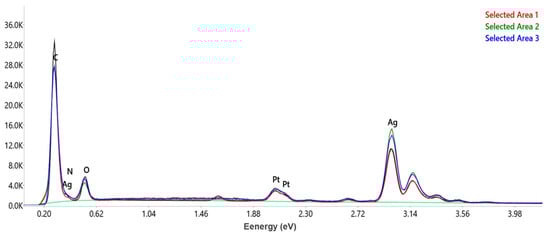 The quantitative analysis of three different areas of the AgNPs surface shows that Ag is the major element with an average of 74.06 wt %, followed by C (14 wt %), O (4 wt %), and N (0.26 wt %). The element Pt is also present most probably due to the sample’s contamination during the preparation process [].