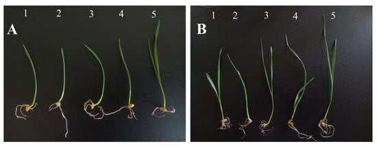 Effect of AgNPs 10 mg/L (1), AgNPs 20 mg/L (2), aqueous A. melanocarpa berry extract 20 mg/L (3), ethanolic A. melanocarpa berry extract 20 mg/L (4), and water/control (5) on wheat growth after 7 (A) and 14 days (B).