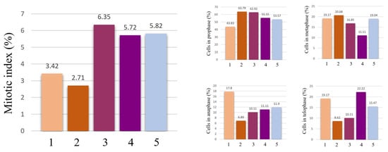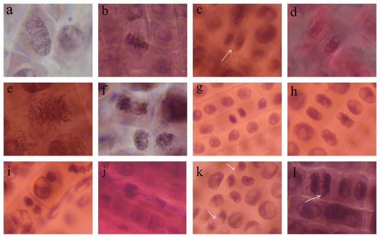 Mitotic studies were conducted on root tips of germinated seeds post treatments. The samples were removed when radicles were 1.5–2 cm long. The root tips containing the meristem tissue were stained with acetocarmine [] and then squashed. A number of approximately 2000 cells per sample was examined at 400× magnification using an Eclipse E400 microscope equipped with a Nikon D700 camera (Nikon, Tokyo, Japan). The mitotic index was calculated as the percentage of cells undergoing mitosis of the total number of cells scored. The number of cells in different mitotic stages (prophase, metaphase, anaphase, and telophase) was expressed as a percentage of the total dividing cells []. The visible aberrations in the chromosomes of the treated samples were also recorded.
