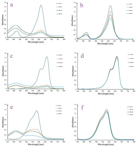 A. melanocarpa berry extract-derived AgNPs photocatalytic reduction in malachite green (a), methylene blue (c), and crystal violet (e) in time vs. controls: malachite green (b), methylene blue (d), and crystal violet (f) solutions.