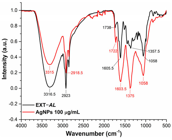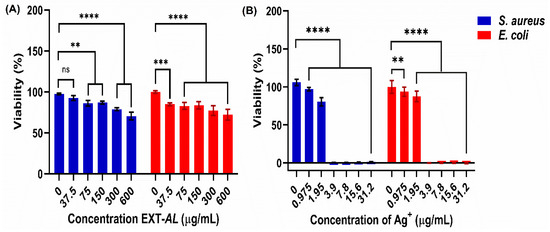 3.9. Antibacterial Activity of EXT-AL and AgNPs