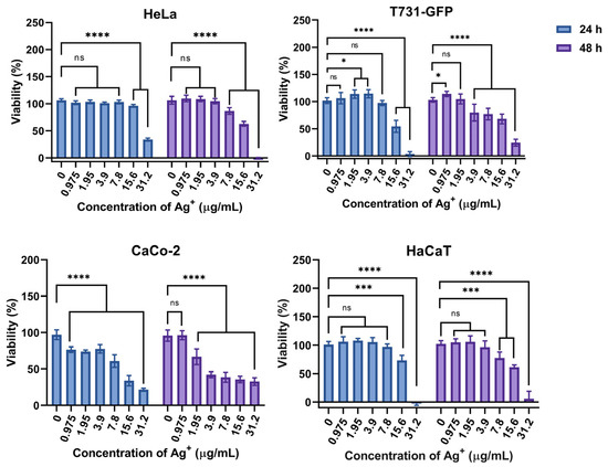 3.11. Cytotoxicity Effect of AgNPs on HeLa, T731-GFP, CaCo-2, and HaCaT Cells