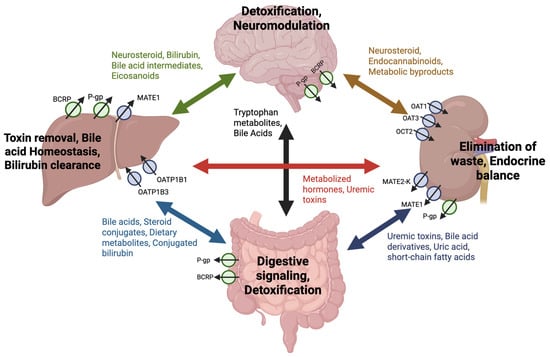 Beyond maternal-infant exchange, drug transporters demonstrate their pivotal role in regulating metabolites across various organ systems. In the liver, OATP1B1 and OATP1B3 mediate the uptake of bile acids, bilirubin, and hormones, ensuring efficient metabolic processing and detoxification. Dysregulation of these hepatic transporters can lead to conditions like cholestasis or hyperbilirubinemia, with broader consequences for lipid metabolism and cardiovascular health [77]. In the kidney, OAT1, OAT3, and OCT2 facilitate the excretion of uremic toxins such as indoxyl sulfate and uric acid, maintaining nitrogen balance and systemic metabolic stability [46,78,79]. Impaired renal transporter function can disrupt the gut-liver-kidney axis, contributing to systemic inflammation, accumulation of toxins, and downstream metabolic dysregulation [20,80].