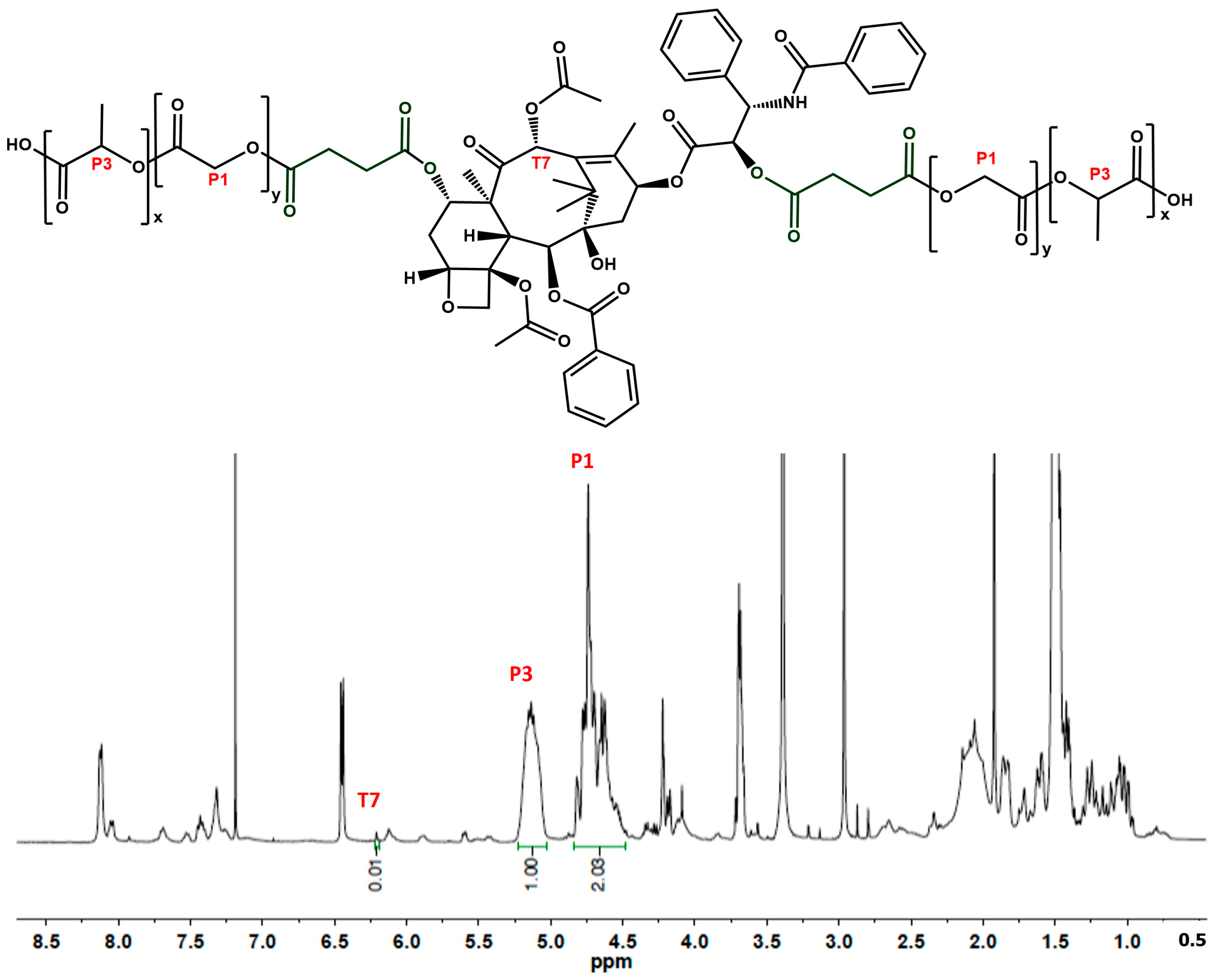 2.4. Synthesis of PTX-PLGA Hybrid with Succinic Acid Linker (Method 1)