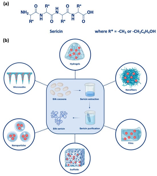 The development of effective drug delivery systems is a key aspect of modern therapeutic strategies [1]. The increasing interest in biopolymers for delivery purposes is due to their natural origin, compatibility with biological systems, and ability to be engineered for diverse applications [2]. More recently, biopolymers such as chitosan, alginate, and silk proteins have attracted greater interest because of inherent characteristics that overcome many disadvantages associated with synthetic polymers, including poor biocompatibility, limited biodegradability, and environmental concerns [3,4]. Among these, silk sericin, a glycoprotein derived from the silk cocoon, is emerging as a promising candidate for drug delivery systems [5]. Historically, sericin was largely considered a waste product in the silk industry and was often discarded during the degumming process of silk fibers. However, traditional medicinal practices in East Asia recognized the therapeutic properties of sericin-rich silk water, using it for its reported skin-soothing and anti-inflammatory effects [6]. Early scientific studies in the mid-20th century began to explore its biochemical composition and biological properties, laying the groundwork for its modern biomedical applications. These early insights have since evolved into a more sophisticated understanding of sericin potential, especially in pharmaceutical and regenerative medicine contexts [7]. Its biocompatibility and biodegradability make sericin unique and an environmentally friendly alternative to lower the risk of toxic accumulation in the body [8]. Additionally, sericin exhibits an amphipathic nature, which allows it to interact with both hydrophilic and hydrophobic drugs, enabling the development of versatile delivery platforms [9]. All these features make sericin a promising candidate for addressing the current needs in drug delivery.